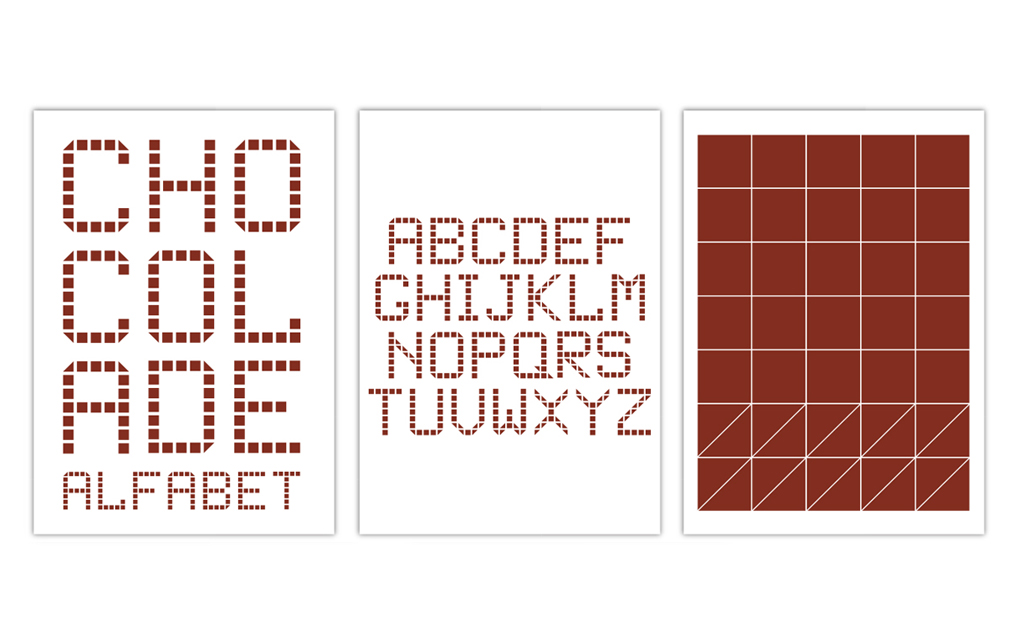 Het Chocolade-alfabet bestaat uit 2 vormen die alle letters kunnen maken. Het betreft de vierkant en de driehoek (1 vierkant = 2 driehoeken).