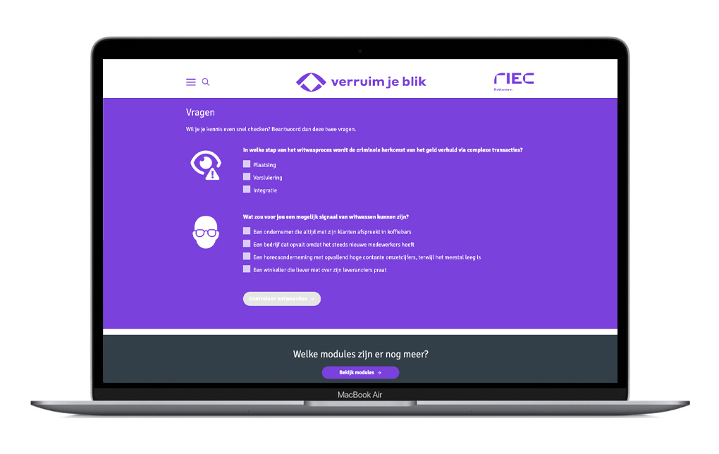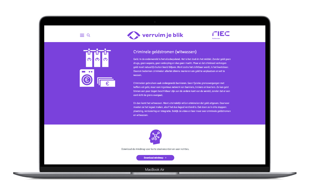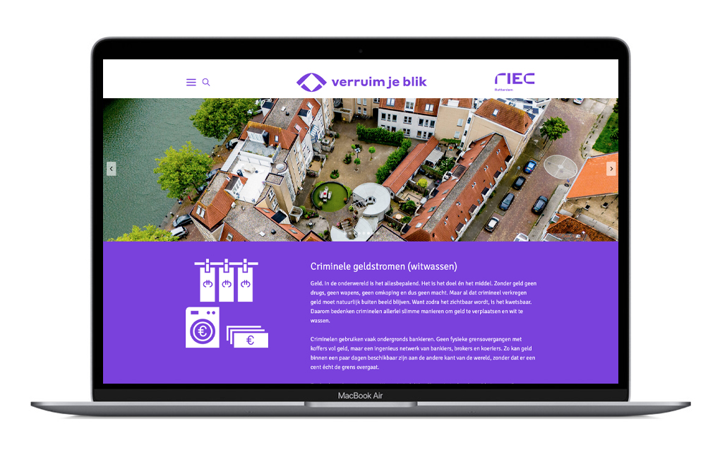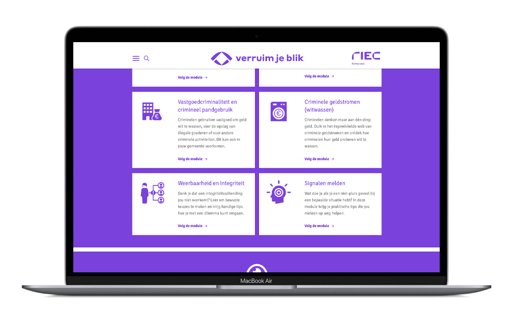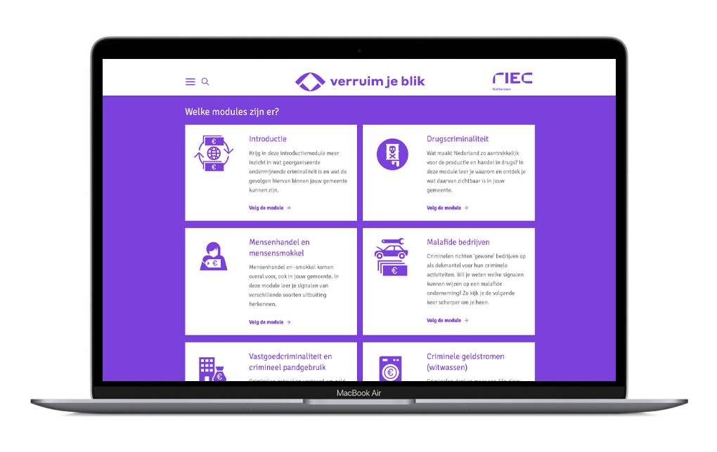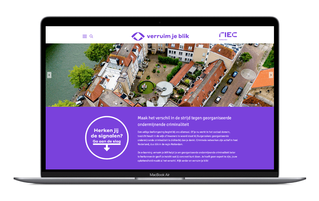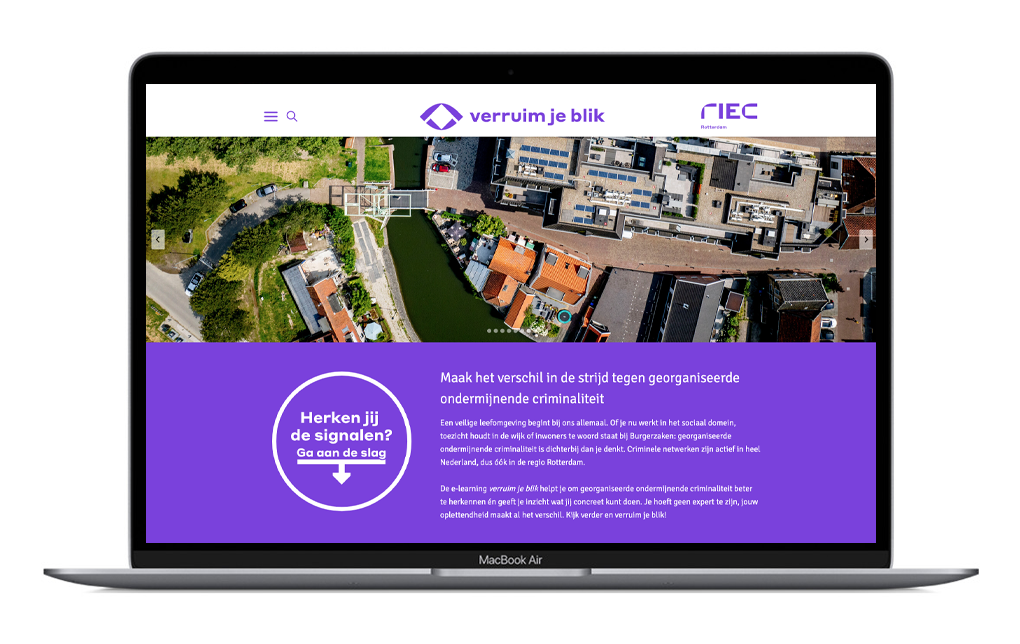 Verruim je blik is een e-learningconcept van Jeroen Bakker (Goudtrainingen), ontwikkeld in opdracht van het RIEC Rotterdam. Het platform vergroot de bewustwording van georganiseerde ondermijnende criminaliteit en geeft professionals in het sociaal en veiligheidsdomein concrete handelingsperspectieven.
