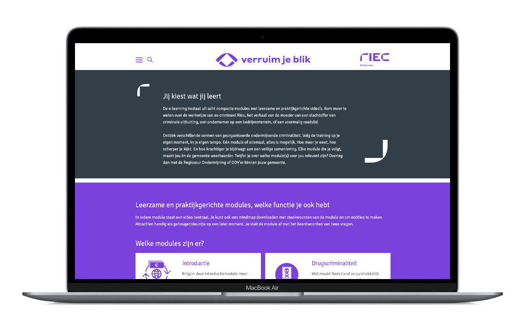 Uniek aan Verruim je blik zijn de interactieve explainvideo’s met echte verhalen van bijvoorbeeld een ex-crimineel, een ondernemer en een ouder van een slachtoffer. Zo wordt theorie gekoppeld aan de praktijk. De training is functie-onafhankelijk en relevant voor iedereen: van baliemedewerker, toezichthouder tot beleidsadviseur.